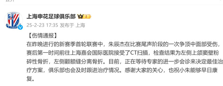在中超揭幕战里面,朱辰杰在比赛最后尾声跟长春亚泰球员一次争顶中面部受伤,在赛后的检查结果为左侧上颌窦壁粉碎性骨折,左侧颧额缝分离骨折。目前恢复的时间还没有办法确定,朱辰杰的受伤,也是让很多球迷担忧申花后面的比赛怎么办, 在3月份国足的比赛又怎么,朱辰杰多年一直都是勤勤恳恳的,上个赛季因为太劳累了,还发持续性发高烧。 有多场比赛并没有出场。